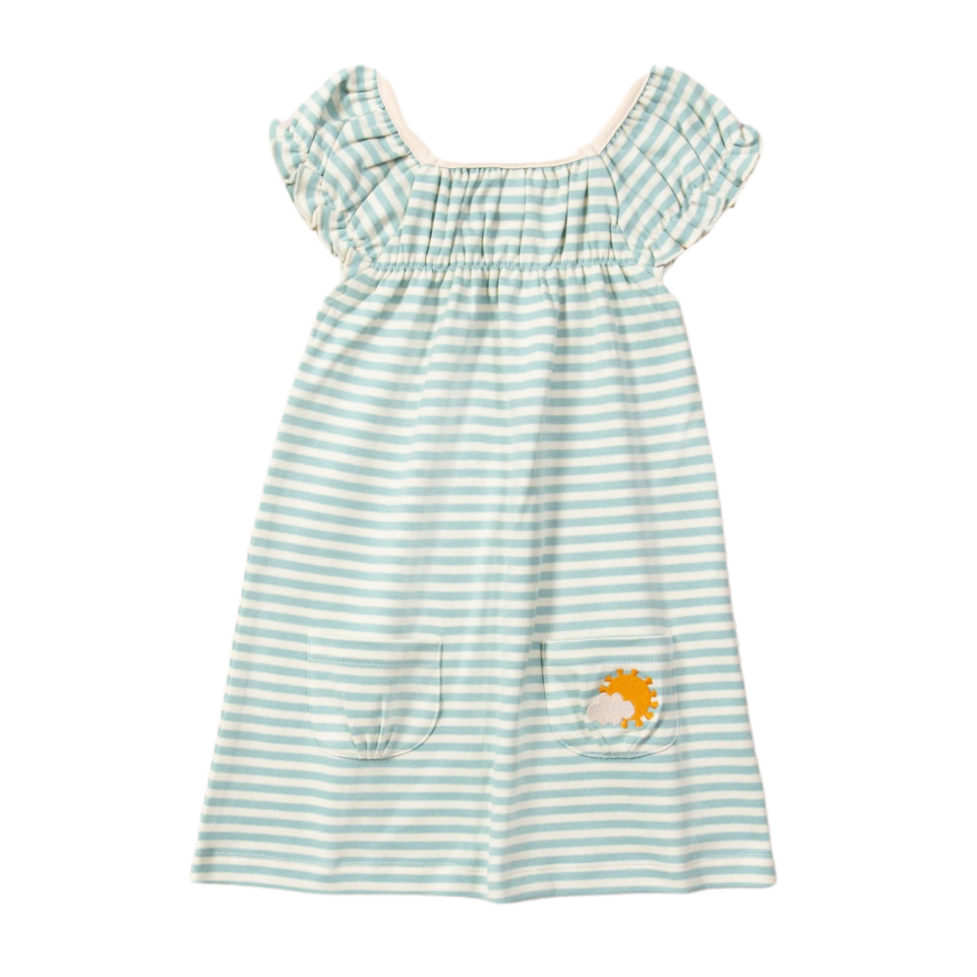 No poppers, no buttons, no zips... no fuss. Just pop on this dress and they're ready to go! It's a really easy to wear summer style, with an elasticated gathered top, frill capped sleeves and a wide skirt with lots of room for movement as they play. It's made from beautifully soft, fantastic quality organic cotton that will keep them comfy all day, and come up like new wash after wash.