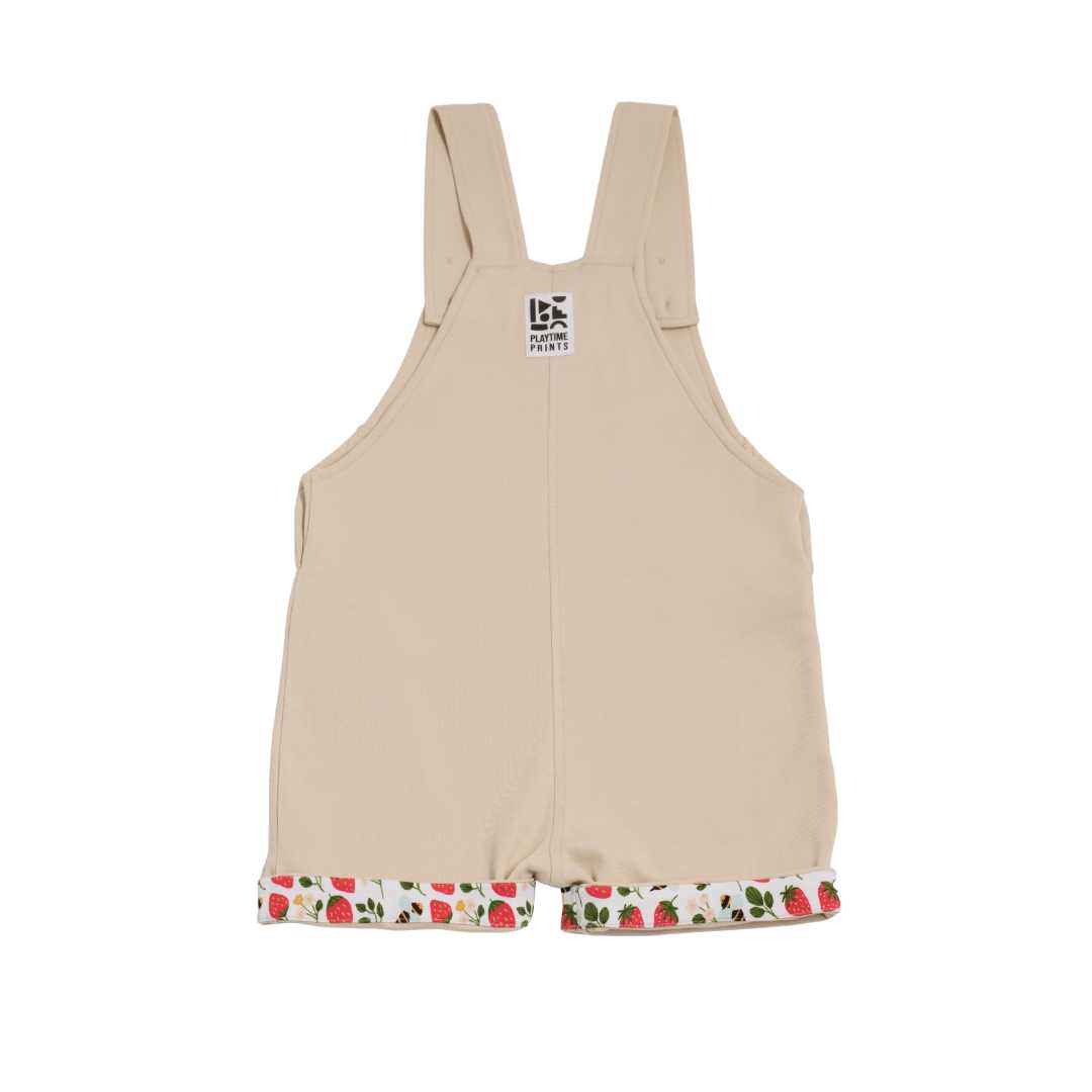 Made from 100% organic cotton, these super comfy short dungarees in natural beige feature charming turn-ups and a fun pocket adorned in Playtime Prints’ playful Strawberry fields print. With contrast honey buttons and two adjustable strap heights, they’re perfect for growing adventurers.