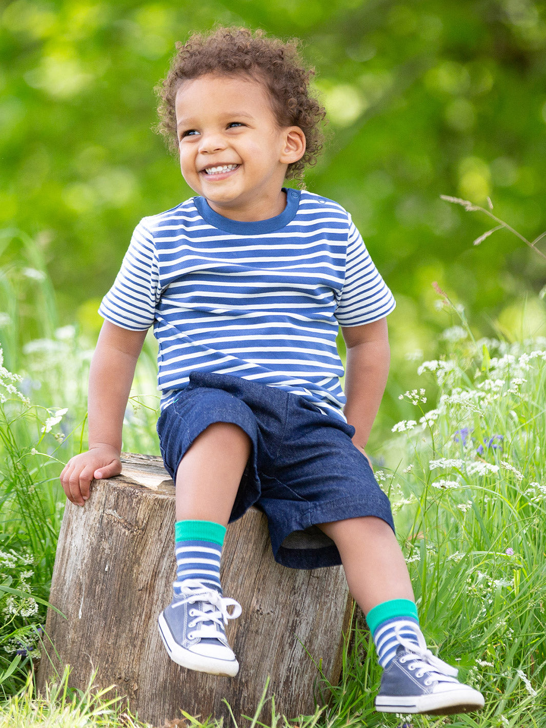 Simple yet stunning, this t-shirt is the perfect companion for those days when you're looking for a reliable wardrobe staple with a little bit of wow. In a classic navy blue and cream yarn dyed stripe, with contrasting stripe width sleeves, this tee is a fabulous match for any of this season's trousers and shorts. Made from 95% organic cotton and 5% elastane for a little bit of stretch, and with popper fastenings for easy changing up to and including size 3 years.